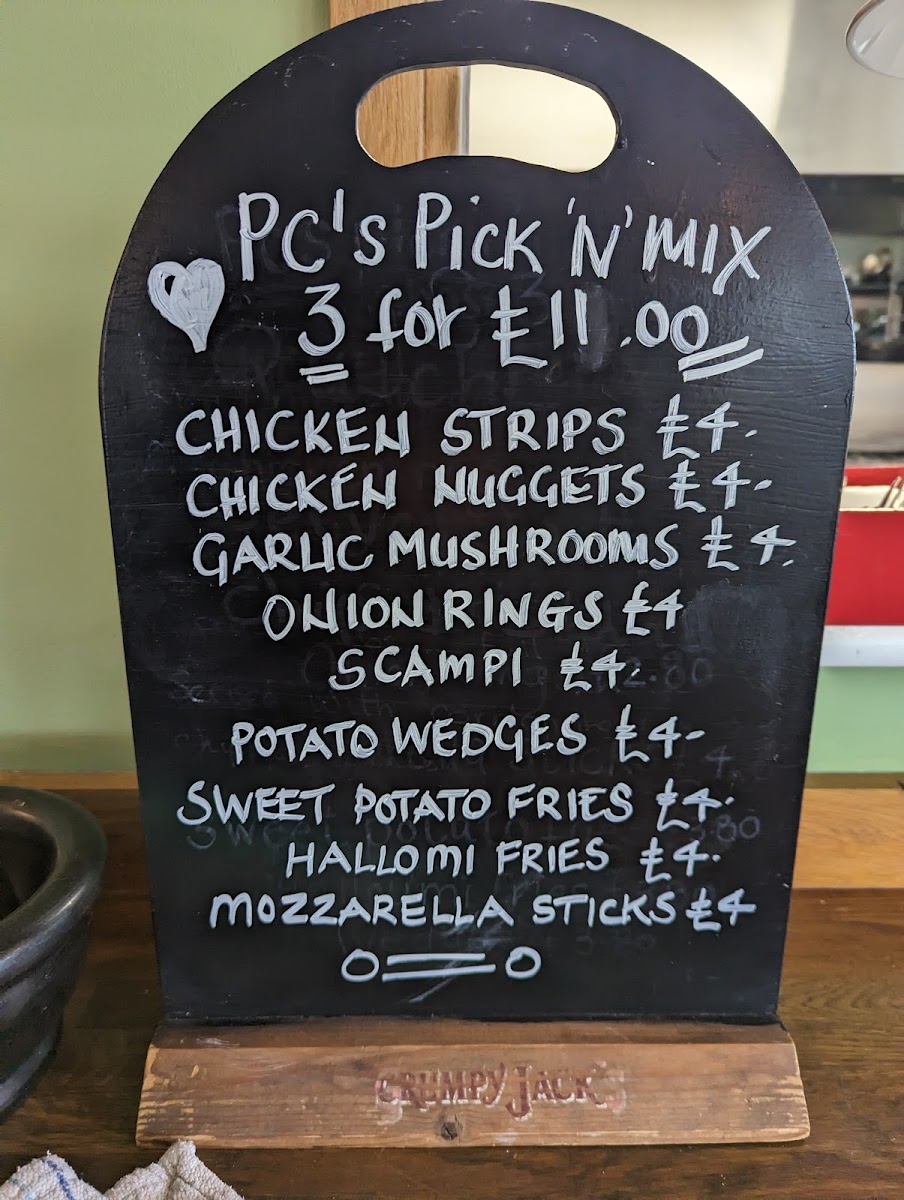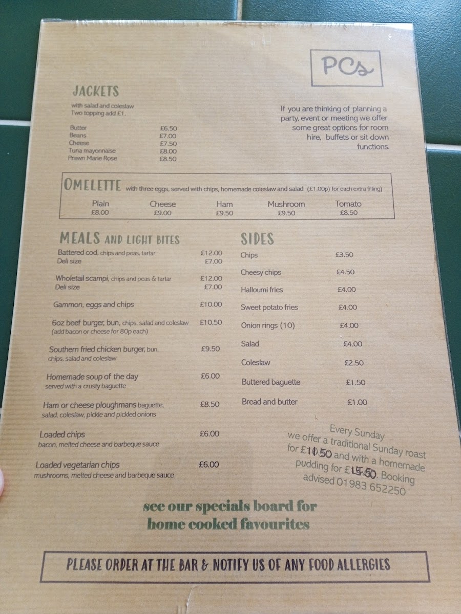Welcome to PC's Cafe and Licensed Bar, a hidden gem nestled in the IOW Pet Centre on Watergate Rd, Newport. This cozy cafe offers a delightful menu featuring hearty options that cater to all tastes. Enjoy a comforting jacket potato with toppings like creamy cheese or zesty tuna mayonnaise, both priced at just £6.50. Complement your meal with sides such as crispy chips, halloumi fries, or a fresh salad for just £1.00.